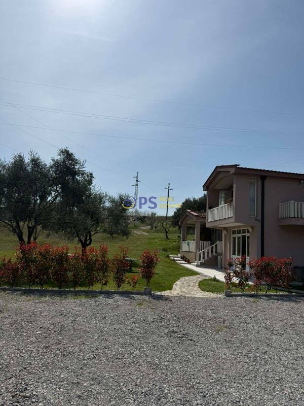 The house is approached by an asphalt road and a large lot with parking spaces, Mediterranean plants and trees.